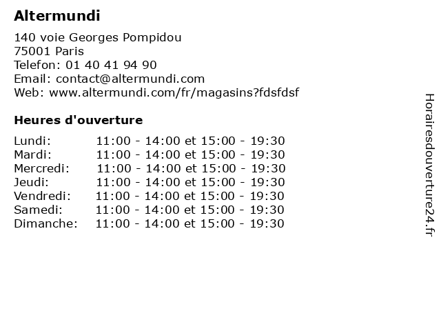| Samedi | 11:00-14:00 et 15:00-19:30 |