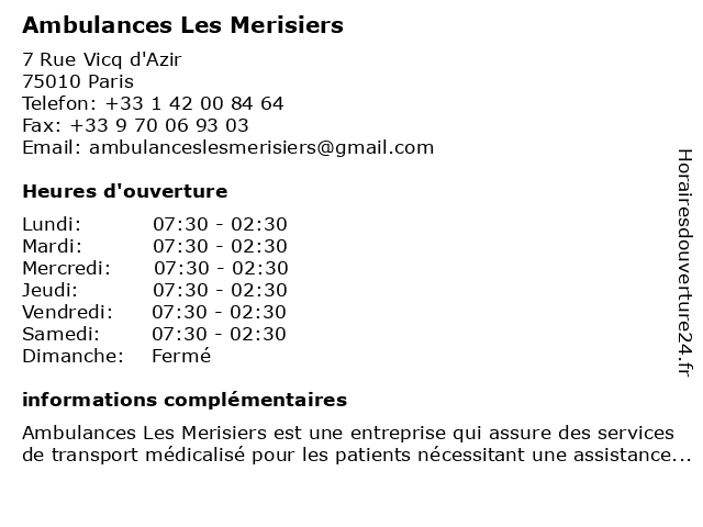 2 Chambre Nationale des Services d'Ambulances - CNSA (Distance: 1,49 km) 57 Rue de Turbigo, 75003 Paris ambulance, association, chambre, cnsa, d'ambulances, des, nationale, paris, sanitaire, services, transport 3 Ambulances Port Royal 75 (Distance: 1,64 km) 37 Avenue Parmentier, 75011 Paris 75, ambulances, port, royal 5 Saint Louis Ambulances (Distance: 2,70 km) 75 Boulevard Sérurier, 75019 Paris ambulances, louis, saint, services, transferts, urgences. santé 6 |