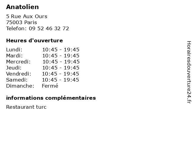 | Lundi | 10:45-19:45 |