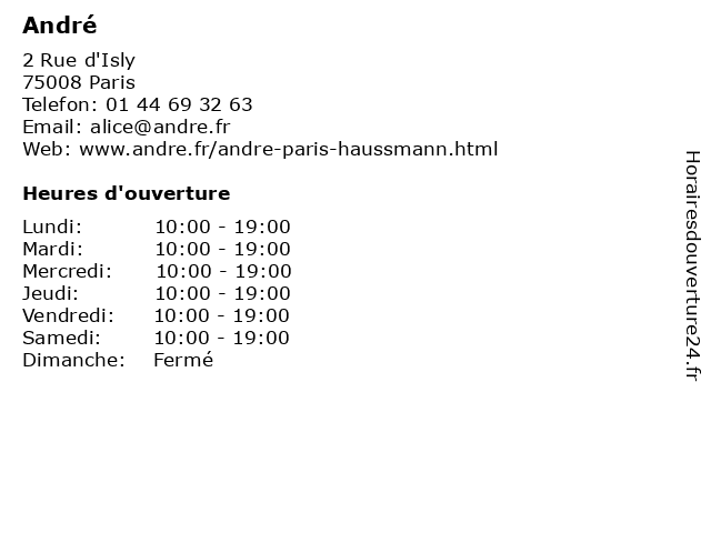 1 André (Distance: 0,44 km) 40 Boulevard Haussmann, 75009 Paris andre, andré, chaussures, magasins, prêt à porter, vêtements 2 André (Distance: 0,46 km) 31 Rue de la Chausse d Antin, 75009 Paris andré, chaussures, enfant, femme, homme, mode, nouveautés 3 André (Distance: 2,05 km) 24-26 Boulevard Saint-Denis, 75010 Paris andré, chaussures, enfant, femme, homme, mode, nouveautés 4 André (Distance: 2,29 km) n/c Rue Basse, 75001 Paris andré, chaussures, enfant, femme, homme, mode, nouveautés 5 André (Distance: 2,81 km) 7 Boulevard Saint Michel, 75005 Paris andré, chaussures, enfant, femme, homme, mode, nouveautés 6 André (Distance: 4,15 km) 117-127 Avenue de Flandre, 75019 Paris andré, chaussures, enfant, femme, homme, mode, nouveautés |