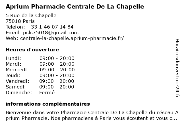 1 Pharmacie Centrale de la Chapelle (Distance: 0,00 km) 5 Rue de la chapelle, 75018 Paris centrale, chapelle, de, la, médicaments, pharmacie, santé, service 2 Église Saint-Denys de la Chapelle (Distance: 0,09 km) 16/18 Rue de la Chapelle, 75018 Paris chapelle, christianisme, chrétien, de, denys, eglise, la, pasteur, religion, saint, secrétariat, église 3 Marché couvert La Chapelle (Distance: 0,13 km) 10 l’Olive, 75018 Paris chapelle, couvert, equipement, l'heure, la, livre, marché, médiathèque, services 4 Boucherie De La Chapelle (Distance: 0,14 km) 10 Rue de l'Olive, 75018 Paris boucherie, chapelle, de, la 5 Parking Zenpark (Porte de la Chapelle) (Distance: 0,40 km) 75 Rue de la Chapelle, 75018 Paris chapelle, de, la, parking, porte, stationnement, zenpark 6 Parking Zenpark (La Chapelle - Cugnot) (Distance: 0,44 km) 14 Rue Cugnot, 75018 Paris chapelle, cugnot, la, parking, stationnement, zenpark |