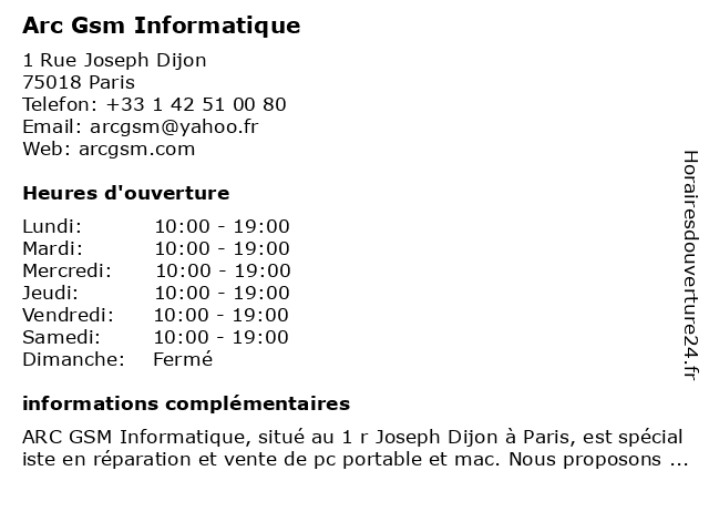 1 Fahmida Informatique (Distance: 0,19 km) 109 Rue de Clignancourt, 75018 Paris assistance, dépannage, fahmida, informatique, pc, réparation 3 Orange Money - Europe Gsm (Distance: 1,16 km) 36 rue Marx Dormoy, 75018 Paris argent, europe, gsm, magasins, money, orange, telephone, transfert 4 Centre d’animation Hébert / Informatique Et Multimédia (Distance: 1,17 km) 12 rue des Fillettes, 75018 Paris centre, centres d'animation, d’animation, equipement, et, hébert, informatique, jardins, l'heure, livre, multimédia, médiathèque, services 5 Point Information Jeunesse (Cours informatique dispensé ) (Distance: 1,22 km) 17 Avenue Tristan, 60650 La Chapelle administration, assoc, cours, dispensé, information, informatique, jeunesse, point, services, services publics 6 |