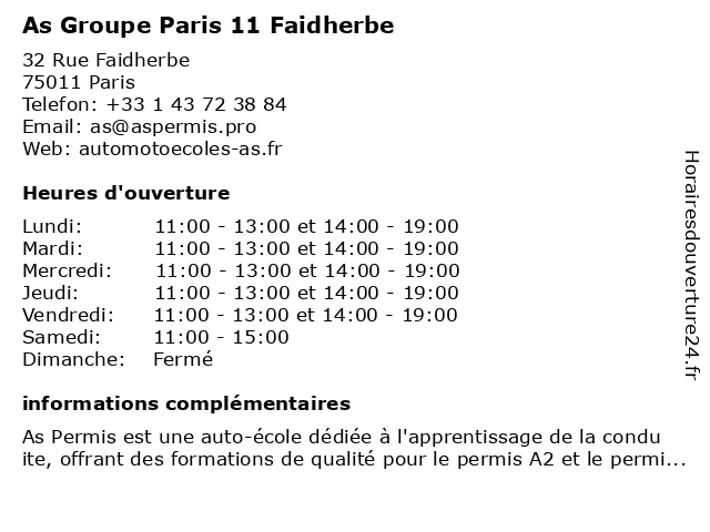 | Mercredi | 11:00-13:00 et 14:00-19:00 |