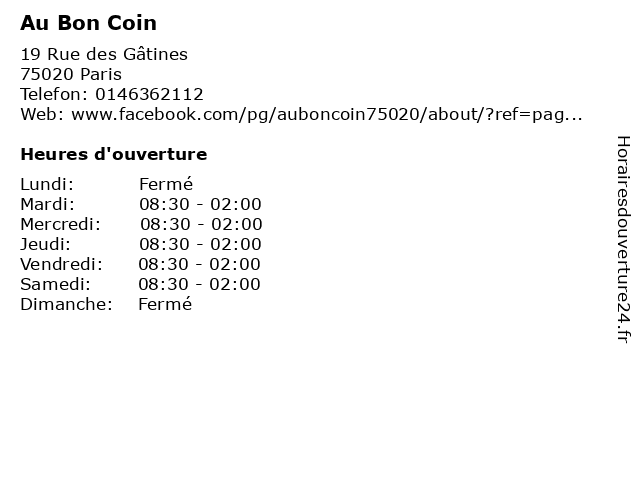 2 Au Bon Coin (Distance: 5,38 km) 49 Rue des Cloys, 75018 Paris au, bar, bistro, bistrot, bon, brasserie, café, coin, pub, restaurant, restauration, resto 3 Au Bon Coin (Distance: 5,80 km) 19 Rue Denis Papin, 94200 Ivry-sur-Seine au, bar, bistro, bistrot, bon, brasserie, café, coin, restaurant, restauration 4 Au Bon Coin (Distance: 6,65 km) Rue Auguste Blanqui, 94400 Vitry Sur Seine bon, cango, carrillo, coin, maribel, perla, restaurants, thomas 6 Au Bon Coin (Distance: 7,41 km) 48 Rue Pierre Larousse, 75014 Paris aris, au, bon, cafe, coin, restaurants |
