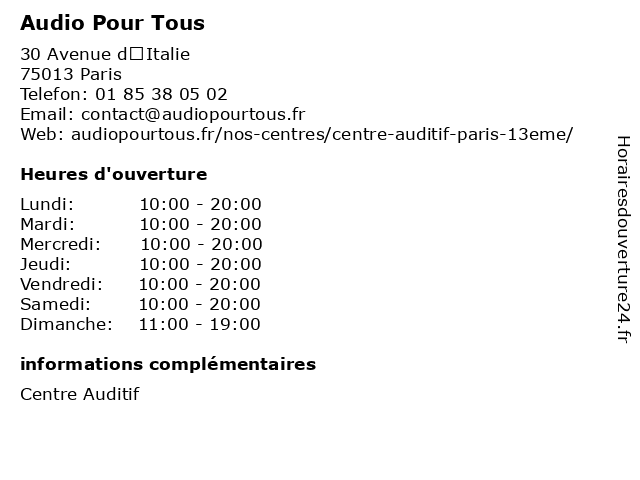 2 Audio Pour Tous (Distance: 8,32 km) n/a Rue du Luxembourg, 94320 Thiais audio, audioprothésiste, audition, auditive, pour, tous, écoute 3 Audio Pour Tous (Distance: 9,04 km) - Avenue de la France libre, 94000 Créteil accessoires, assistance, audio, auditif, magasin, medicale, pour, tous 4 Audio Pour Tous (Distance: 13,55 km) 6 Rue de la Longueraie, 91270 Vigneux-sur-Seine audio, audioprothésiste, audition, auditive, pour, tous, écoute 5 Audio Pour Tous (Distance: 14,89 km) 50 Avenue du Marechal Foch, 95100 Argenteuil audio, audioprothésiste, audition, auditive, pour, tous, écoute 6 Audio Pour Tous (Distance: 15,68 km) n/a Chemin de Briis, 91140 Villebon-sur-Yvette audio, audioprothésiste, audition, auditive, pour, tous, écoute |