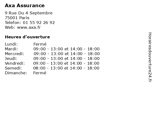 1 Axa Assurance (Distance: 0,53 km) 9 Avenue De L Opera, 75001 Paris assurance, assurance prêt, assurances, axa, services 2 Axa Assurance (Distance: 0,99 km) 72 Boulevard Haussmann, 75002 Paris assurance, assurance prêt, assurances, axa, services 3 Axa Assurance (Distance: 1,19 km) 51 Rue Notre Dame De Lorette, 75009 Paris assurance, assurance prêt, assurances, axa, services 4 AXA Assurance (Distance: 1,31 km) 15 Rue De Saints Peres, 75006 Paris assurance, assurance auto, assurance habitation, axa 5 Axa Assurance (Distance: 1,33 km) 51 Rue de Turbigo, 75003 Paris assurance, assurance prêt, assurances, axa, services 6 AXA Assurance (Distance: 1,33 km) 51 Rue de Turbigo, 75003 Paris assurance, assurance appartement, assurance auto, assurance entreprise, assurance epargne, assurance habitation, assurance maison, assurance professionnelle, assurance santé, assurance voiture, axa, banque, da, samuel, silva |