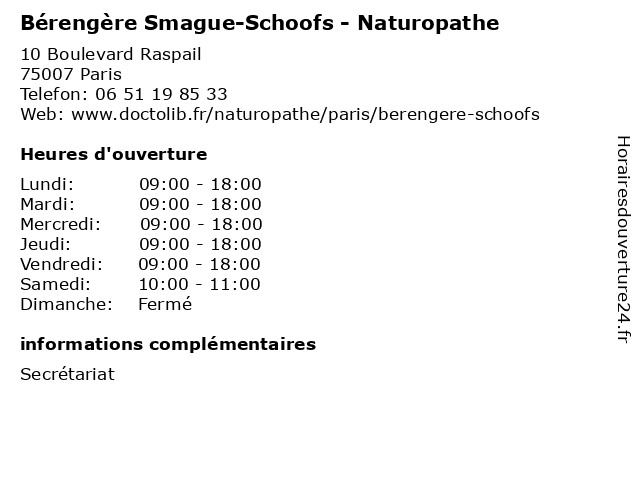 1 Dr Schoofs Florent - Ostéopathe (Distance: 0,01 km) 10 Boulevard raspail, 75007 Paris docteur, dr, florent, ostéopathe, paris, schoofs 2 Stéphanie Dray - Naturopathe (Distance: 0,19 km) 1 Rue de Narbonne, 75007 Paris dray, medecin, naturopathe, plante, sante, stéphanie 3 Charlotte Levin - Naturopathe (Distance: 0,28 km) 11 Rue Chomel, 75007 Paris charlotte, consultation, docteur, levin, médecin, médecine, naturopathe, secrétariat, traitement 4 Mélodie Dewever - Naturopathe (Distance: 1,37 km) 10 Rue Cambon, 75001 Paris dewever, docteur, mélodie, naturopathe, sante, soins 5 Emilie Rolet Galy - Naturopathe (Distance: 1,48 km) 81 Avenue Bosquet, 75007 Paris emilie, galy, medecin, naturopathe, plante, rolet, sante 6 Caroline Mamelli Burns - Naturopathe (Distance: 1,66 km) 9 Boulevard de la Madeleine, 75001 Paris burns, caroline, mamelli, medecin, naturopathe, plante, sante |