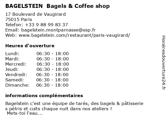 1 BAGELSTEIN Bagels & Coffee shop (Distance: 1,01 km) 9 Rue Saint-Placide, 75006 Paris bagels, bagelstein, blague, café, cakes, coffee, cookies, fast food, pastries, pâtisseries, sandwichs, shop, soupes 2 BAGELSTEIN Bagels & Coffee shop (Distance: 1,09 km) 35 Rue de Vaugirard, 75006 Paris bagels, bagelstein, blague, café, cakes, coffee, cookies, fast food, pastries, pâtisseries, sandwichs, shop, soupes 3 BAGELSTEIN Bagels & Coffee shop (Distance: 1,97 km) 44 Avenue Bosquet, 75007 Paris bagels, bagelstein, blague, café, cakes, coffee, cookies, fast food, pastries, pâtisseries, sandwichs, shop, soupes 4 BAGELSTEIN Bagels & Coffee shop (Distance: 4,22 km) 8 Avenue Carnot, 75017 Paris bagels, bagelstein, blague, café, cakes, coffee, cookies, fast food, pastries, pâtisseries, sandwichs, shop, soupes 5 BAGELSTEIN Bagels & Coffee shop (Distance: 4,35 km) 106 Rue du Faubourg Saint-Antoine, 75012 Paris bagels, bagelstein, blague, café, cakes, coffee, cookies, fast food, pastries, pâtisseries, sandwichs, shop, soupes 6 BAGELSTEIN Bagels & Coffee shop (Distance: 4,40 km) 31 Boulevard de Courcelles, 75017 Paris bagels, bagelstein, blague, café, cakes, coffee, cookies, fast food, pastries, pâtisseries, sandwichs, shop, soupes |