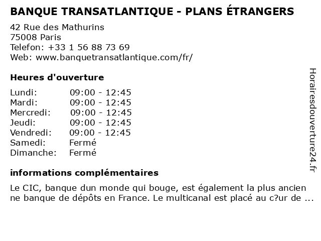 1 BANQUE TRANSATLANTIQUE - NON COTÉS (Distance: 0,00 km) 42 Rue des Mathurins, 75008 Paris banque, cotés, non, transatlantique 2 BANQUE TRANSATLANTIQUE - PLANS FRANÇAIS GME (Distance: 0,00 km) 42 Rue des Mathurins, 75008 Paris banque, français, gme, plans, transatlantique 3 BANQUE TRANSATLANTIQUE - STOCKPLAN MIDDLE OFFICE (Distance: 0,03 km) 42 Rue des Mathurins, 75008 Paris banque, middle, office, stockplan, transatlantique 5 Bred Banque Populaire (Distance: 0,14 km) 1 Rue du Havre, 75008 Paris agence, argent, assurance, bancaire, banque, bred, conseil, crédit, finances, populaire, pret 6 CRIT PARIS Banque & Finance (Distance: 0,27 km) 26 Boulevard Malesherbes, 75008 Paris banque, crit, finance, paris |