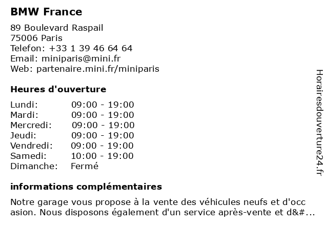 1 Bmw Distribution (Distance: 0,00 km) Bmw Distribution Mini Raspail, 75006 Paris bmw, distribution, neuves, occasion, vente, voitures 2 BMW (Après-Vente) (Distance: 1,98 km) 17 Boulevard Sebastopol, 75001 Paris après, automobiles, bmw, concéssionnaire, garage, motos, vente 4 BMW (Pièces de rechange) (Distance: 2,93 km) 93 Avenue Emile Zola, 75015 Paris automobiles, bmw, concéssionnaire, de, garage, motos, pièces, rechange 5 BMW (Après-Vente) (Distance: 2,93 km) 93 Avenue Emile Zola, 75015 Paris après, automobiles, bmw, concéssionnaire, garage, motos, vente 6 BMW (Distance: 4,01 km) 71 Avenue de Versailles, 75016 Paris automobiles, bmw, concessionnaire, garage, motos |