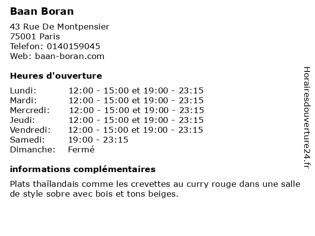 1 Baan Boran (Distance: 0,00 km) 43 rue de Montpensier, 75001 Paris baan, boran, emporter, gipcy, restaurants 3 Restaurant Baan Thaï (Distance: 0,99 km) 15 rue de la Ferronnerie, 75005 Paris baan, cuisine, restaurant, restaurants, royale, thai, thaï 4 Baan kheo (Distance: 3,39 km) 42 Rue Frémicourt, 75015 Paris baan, kheo, massage, relaxation, soins, spa 6 Baan Issan (Distance: 3,81 km) 12 Rue Véronèse, 75013 Paris baan, issan, nourriture, restaurant, services, thai |
