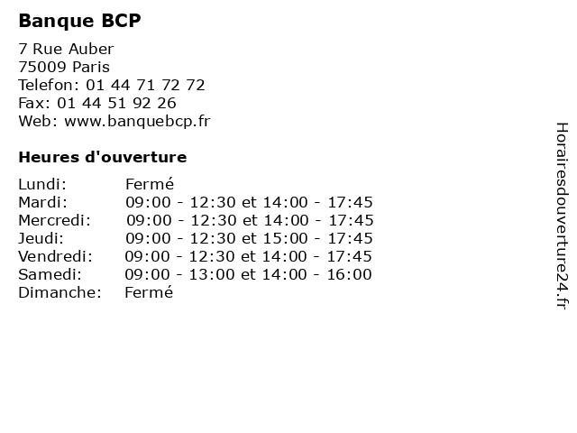 1 Banque BCP (Distance: 0,09 km) 5 Rue Auber, 75009 Paris assurances, banque, banque bcp, banques, bcp, services 2 Banque BCP (Distance: 3,60 km) 145 Rue de la Pompe, 75116 Paris assurances, banque, banque bcp, banques, bcp, services 3 Banque BCP (Distance: 4,04 km) 13 Rue Paul Barruel, 75015 Paris assurances, banque, banque bcp, banques, bcp, services 4 Banque BCP (Distance: 4,24 km) 53 Rue de Villiers, 92200 Neuilly-sur-Seine assurances, banque, banque bcp, banques, bcp, services 5 Banque BCP (Distance: 4,72 km) 65 Rue Albert Dhalenne, 93400 Saint-Ouen assurances, banque, banque bcp, banques, bcp, services 6 Banque BCP (Distance: 5,91 km) 106/108 Avenue D'Argenteuil, 92600 Asnieres-sur-Seine assurances, banque, banque bcp, banques, bcp, services |