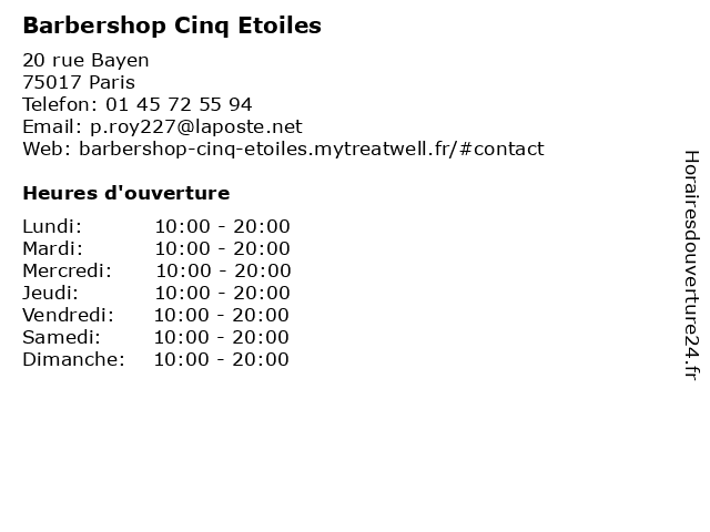 1 Barbershop Cinq Etoiles (Distance: 0,00 km) 20 rue Bayen, 75017 Paris barbershop, barbier, cinq, coiffeur, coiffure, coupe, etoiles, homme, rasage 2 Aux Etoiles Ass Gagine s Murat (Distance: 2,47 km) 41 Rue De Londres, 75008 Paris ass, aux, etoiles, gagine, murat, restaurants 4 Marchand d'Etoiles (Distance: 5,85 km) 4 Rue du Pont aux Choux, 75003 Paris art, business, d'etoiles, furnitures, marchand, stores 5 Pharmacie des Etoiles (Distance: 5,89 km) 5 place aux Etoiles, 93210 La Plaine Saint Denis des, etoiles, homéopathie, médicaments, orthopédie, parapharmacie, pharmacie 6 |