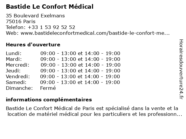 1 Bastide le Confort Médical (Distance: 1,96 km) 105 Route de la Reine, 92100 Boulogne-Billancourt bastide, confort, le, médical 2 Bastide Le Confort Médical (Distance: 2,13 km) 37B Avenue Victor Cresson, 92130 Issy les Moulineaux accessoires, assistance, bastide, confort, le, magasin, medicale, médical, santé 3 Bastide Le Confort Médical (Distance: 4,10 km) 68 boulevard Brune, 75014 Paris accessoires, assistance, bastide, confort, le, magasin, medicale, médical, santé 4 Bastide Le Confort Médical (Distance: 5,96 km) 1 Rue Danton, 75006 Paris accessoires, assistance, bastide, confort, le, magasin, medicale, médical, santé 5 Bastide Le Confort Médical (Distance: 8,40 km) 39 Rue Hermel, 75018 Paris bastide, confort, le, médical 6 Bastide Le Confort Médical (Distance: 8,83 km) 6 Rue Dispan, 94240 L'Hay les Roses accessoires, assistance, bastide, confort, le, magasin, medicale, médical, santé |