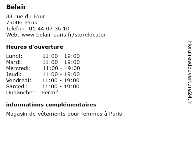 1 Belair (Distance: 3,18 km) 117 rue du faubourg Saint Antoine, 75012 Paris accessoires, belair, boutique, mode, vetement 2 Belair (Distance: 5,18 km) 31 Rue d'Alsace, 92300 Levallois-Perret accessoires, belair, mode, prêt-à-porter, vêtements 3 Belair Paris (Distance: 0,70 km) 97 rue du bac, 75007 Paris accessoires, belair, boutique, magasin, paris 4 BelAir - Prêt à Porter (Distance: 2,05 km) 2 rue des rosiers, 75004 Paris accessoires, belair, boutique, magasin, porter, prêt 5 Belair Paris (Distance: 2,98 km) 9 rue de charonne, 75011 Paris accessoires, belair, boutique, magasin, paris 6 Belair Paris (Distance: 3,18 km) 117 rue du faubourg saint antoine, 75012 Paris accessoires, belair, boutique, magasin, paris |