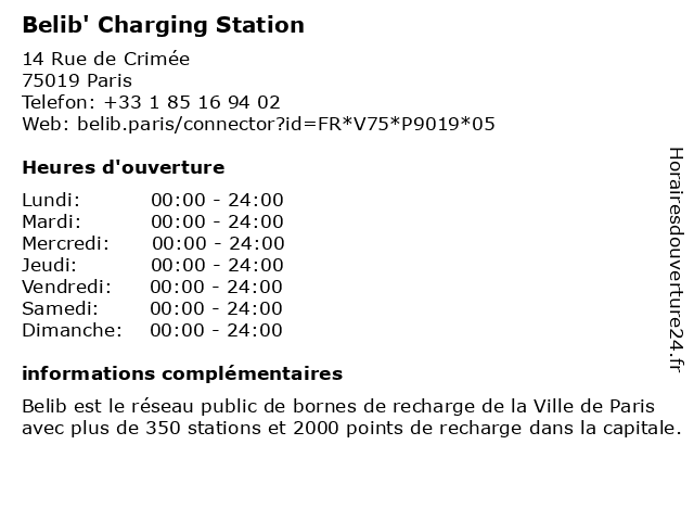 1 Belib’ - Borne de recharge électrique (Distance: 0,58 km) 54 Boulevard Sérurier, 75019 Paris automobile, belib’, borne, de, recharge, transports, électrique, électriques 2 Belib’ - Borne de recharge électrique (Distance: 0,84 km) 4 Place Armand Carrel, 75019 Paris automobile, belib’, borne, de, recharge, transports, électrique, électriques 3 Belib’ - Borne de recharge électrique (Distance: 1,08 km) 227 Avenue Gambetta, 75020 Paris automobile, belib’, borne, de, recharge, transports, électrique, électriques 4 Belib' Charging Station (Distance: 1,21 km) 9 Rue Adolphe Mille, 75019 Paris abonnement belib, application belib, badge belib, belib', borne ac, borne boost, borne dc, borne de recharge belib, borne flex, bornes belib paris, bornes de recharge publiques paris, charging, comment utiliser une borne belib, prise ef, prise t2, recharge de nuit, recharge deux-roues électrique, recharger paris, station, station de recharge électrique, tarifs recharge électrique, trouver une borne de recharge, voiture électrique paris 5 Belib' Charging Station (Distance: 4,32 km) 76 Rue de la Victoire, 75009 Paris abonnement belib, application belib, badge belib, belib', borne ac, borne boost, borne dc, borne de recharge belib, borne flex, bornes belib paris, bornes de recharge publiques paris, charging, comment utiliser une borne belib, prise ef, prise t2, recharge de nuit, recharge deux-roues électrique, recharger paris, station, station de recharge électrique, tarifs recharge électrique, trouver une borne de recharge, voiture électrique paris 6 Belib’ - Borne de recharge électrique (Distance: 1,64 km) 7 Place du Colonel Fabien, 75010 Paris automobile, belib’, borne, de, recharge, transports, électrique, électriques |
