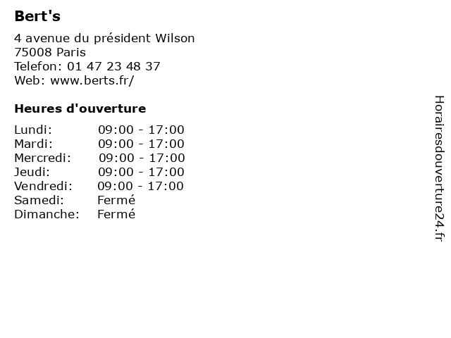 1 Bert's (Distance: 0,01 km) 4 Avenue Du Président Wilson, 75008 Paris bar à salades, bert's, restaurant à emporter, restaurants, salon de thé, snack 2 Bert's (Distance: 0,52 km) 55 Rue Pierre Charron, 75008 Paris bert's, haut de gamme, plats, restauration rapide, saisons, sandwiches 3 Dr. Bert Fanny - Psychologue (Distance: 5,08 km) 139 Rue du Dauphiné, 69003 Boulogne-Billancourt bert, docteur, dr., fanny, medecins, psychologue, sante 4 École élémentaire publique Paul Bert A (Distance: 5,99 km) 62 Rue Paul Déroulède, 92270 Bois-Colombes bert, cours, paul, publique, servicios, école, élémentaire 5 Ecole Maternelle Publique Paul Bert - Meudon (Distance: 7,07 km) 28 rue Marais, 92190 Meudon bert, ecole, education, maternelle, meudon, paul, publique, services 6 École élémentaire publique Paul Bert (Distance: 8,72 km) 1 Paul Bert, 94160 Saint-Mandé bert, ecole, education, paul, publique, services, école, élémentaire |