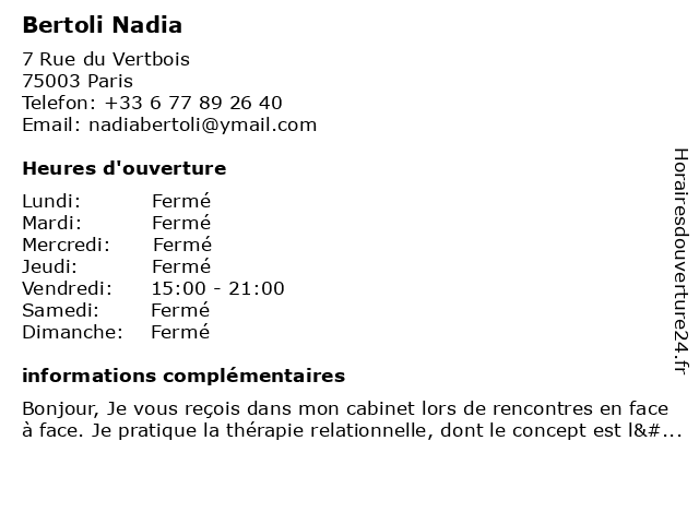1 Agence Nadia Cyrille (Distance: 0,30 km) 322 Rue Saint Martin, 75003 Paris agence, cyrille, nadia, restaurants 2 Nadia Madani - Naturopathe (Distance: 0,65 km) 35-37 Rue Beaubourg, 75003 Paris madani, medecin, nadia, naturopathe, plante, sante 4 Maître Nadia Belrhomari - Avocat (Distance: 0,74 km) 2 rue du Cygne, 75001 Paris avocat, belrhomari, justice, lois, maitre, maître, nadia 5 Nadia Benbrima - Hypnothérapeute (Distance: 0,78 km) 58 Rue de Cléry, 75002 Paris benbrima, hypno, hypnose, hypnothérapeute, nadia, sante 6 Dr Nadia Amrane - Acupunctrice (Distance: 1,17 km) 96 Rue de Rivoli, 75004 Paris acupunctrice, amrane, consultation, docteur, dr, med, médecin, médecine, nadia, secrétariat, traitement |