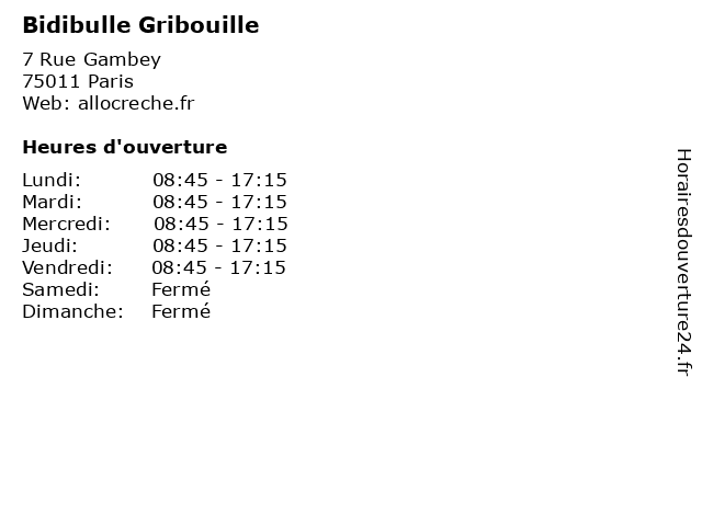 1 Le Gribouille (Distance: 1,39 km) 44 rue de Rivoli, 75004 Paris brasserie, français traditionnel, gribouille, le, restaurant 2 Crèche Associative Gribouille (Distance: 4,83 km) 11ter-11quater Rue d'Alésia, 75014 Paris accueil, associative, creche, crèche, enfant, garderie, gribouille, éveil 3 Crèche collective Gribouille Alesia (Distance: 4,95 km) 11 Ter Rue d'Alésia, 75014 Paris alesia, collective, crèche, crèches, gribouille, services, services à la personne 4 Gribouille et Patouille - Maison d'Assistantes Maternelles (MAM) (Distance: 18,43 km) 64 Rue du Chemin Vert, 95330 Domont assistant, d'assistantes, enfants, et, famille, gribouille, jardin d'enfants, maison, mam, maternelles, patouille, soins 5 Multi Accueil Gribouille - Les prés Mouchards / Accueil régulier (Distance: 26,99 km) 30 16 Allée du Bois Carré, 91190 Gif-sur-Yvette accueil, caregivers houses, child care, family home, gribouille, home care, kindergartens, les, micro-nurseries, mouchards, multi, parental home, prés, régulier 6 Crèche Kiddies Beslay (Distance: 0,25 km) 19 passage Beslay, 75011 Paris beslay, crèche, crèches, kiddies, services, services à la personne |