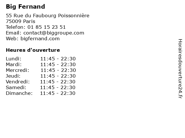 1 Big Fernand (Distance: 0,94 km) 32 Rue Saint-Sauveur, 75002 Paris américain, atelier, big, burger, burgers, fast, fernand, food, hamburger, menus, rapide, restaurant, restauration 2 Big Fernand (Distance: 1,31 km) 99 Rue de Provence, 75009 Paris américain, atelier, big, burger, burgers, fast, fernand, food, hamburger, menus, rapide, restaurant, restauration 3 Big Fernand (Distance: 2,53 km) 168 boulevard Saint-Germain, 75006 Paris américain, atelier, big, burger, burgers, fast, fernand, food, hamburger, menus, rapide, restaurant, restauration 4 Big Fernand (Distance: 2,57 km) 12 avenue de Villiers, 75017 Paris américain, atelier, big, burger, burgers, fast, fernand, food, hamburger, menus, rapide, restaurant, restauration 5 Big Fernand (Distance: 2,87 km) 36 Rue de la Roquette, 75011 Paris américain, atelier, big, burger, burgers, fast, fernand, food, hamburger, menus, rapide, restaurant, restauration 6 Big Fernand (Distance: 3,88 km) 86 Boulevard du Montparnasse, 75014 Paris américain, atelier, big, burger, burgers, fast, fernand, food, hamburger, menus, rapide, restaurant, restauration |