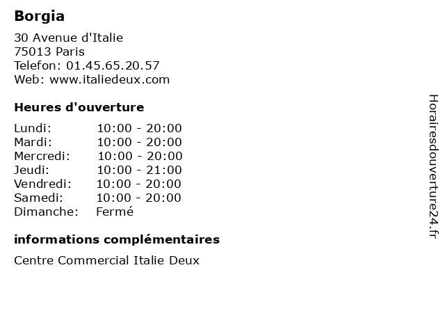 1 Maître Valence Borgia - Avocate (Distance: 4,69 km) 26 Rue du 4 septembre, 75002 Paris avocate, avocats, borgia, cabinet, conseils, contentieux, juridique, justice, litiges, maître, services, valence 2 Boatilus (Distance: 0,00 km) 30 Avenue d'Italie, 75013 Paris boatilus, cafe, enfants.chaussures, lingerie, mode hemmes, mode homme, restaurant 3 CMG Sports Club (Distance: 0,00 km) 30 Avenue d'Italie, 75013 Paris cafe, club, cmg, enfants.chaussures, lingerie, mode hemmes, mode homme, restaurant, sports 4 Didier Guerin (Distance: 0,00 km) 30 Avenue d'Italie, 75013 Paris cafe, didier, enfants.chaussures, guerin, lingerie, mode hemmes, mode homme, restaurant 5 Epicéa (Distance: 0,00 km) 30 Avenue d'Italie, 75013 Paris cafe, enfants.chaussures, epicéa, lingerie, mode hemmes, mode homme, restaurant 6 Foot Locker (Distance: 0,00 km) 30 Avenue d'Italie, 75013 Paris cafe, enfants.chaussures, foot, lingerie, locker, mode hemmes, mode homme, restaurant |