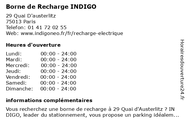 1 Borne de Recharge INDIGO (Distance: 0,42 km) 21 Rue Abel Gance, 75013 Paris borne, de, indigo, recharge 2 Borne de Recharge INDIGO (Distance: 0,65 km) 205 Rue De Bercy, 75012 PARIS borne, de, indigo, recharge 3 Borne de Recharge INDIGO (Distance: 0,86 km) 19/21 Rue Emile Durkheim, 75013 Paris borne, de, indigo, recharge 4 Borne de Recharge INDIGO (Distance: 1,36 km) 82 bis Avenue Ledru Rollin, 75012 Paris borne, de, indigo, recharge 5 Borne de Recharge INDIGO (Distance: 1,54 km) 4-6 Place Bernard Halpern, 75005 Paris borne, de, indigo, recharge 6 Borne de Recharge INDIGO (Distance: 3,29 km) 149 Rue Saint Denis, 75002 Paris borne, de, indigo, recharge |