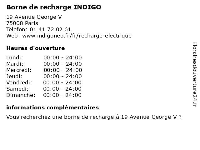 1 Borne de recharge INDIGO (Distance: 0,59 km) 65 Rue Pierre Charron, 75008 Paris borne, de, indigo, recharge 2 Borne de Recharge INDIGO (Distance: 0,74 km) 103 Avenue Des Champs-élysées, 75008 Paris borne, de, indigo, recharge 3 Borne de recharge INDIGO (Distance: 0,87 km) 3 Avenue Matignon, 75008 Paris borne, de, indigo, recharge 4 5 Borne de recharge INDIGO (Distance: 1,41 km) 100 Avenue Victor Hugo, 75016 Paris borne, de, indigo, recharge 6 Borne de recharge INDIGO (Distance: 1,85 km) 103 Rue Jouffroy D'abbans, 75017 Paris borne, de, indigo, recharge |