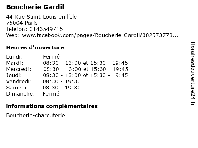 1 Boucherie Gardil (Distance: nan km) 44 Rue Saint-Louis en l'Île, 75004 Paris artisan, boucher, boucherie, charcuterie, charcutier, gardil, poissonnerie, rotisserie, viande 2 Jean-Marc Gardil - Ostéopathe (Distance: 1,33 km) 81 Avenue Ledru-Rollin, 75012 Paris consultation, gardil, jean, marc, médecine, ostéopathe, santé 4 Boucherie Robert et René (Distance: 1,95 km) 13 Rue de faubourg du temple, 75010 Paris boucherie, et, paris, rené, robert 5 La Boucherie (Distance: 4,20 km) 14 Boulevard des Batignolles, 75017 Paris beverages, boucherie, carpaccios, desserts, fishes, la, local dishes, meat, salads 6 Boucherie Le Bourdonnec (Distance: 6,08 km) 172 Avenue victor hugo, 75116 Paris boucherie, bourdonnec, le, paris |