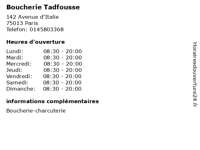 2 Boucherie H Viandes (Distance: 0,07 km) 95 Avenue d 'Italie, 75013 Paris boucherie, boucheries, charcuterie, viandes, volailles 3 Boucherie Charcuterie Barault Sébastien (Distance: 0,32 km) 23 Rue du Dr Leray, 75013 Paris artisan, barault, boucher, boucherie, charcuterie, charcutier, poissonnerie, rotisserie, sébastien, viande 4 Boucherie Saing Heng (Distance: 0,55 km) 51 avenue d'Ivry, 75013 Paris boucherie, boucheries, heng, new, poulets, saing, triperie 5 Boucherie Berbèche (Distance: 0,59 km) 5 Rue Vandrezanne, 75013 Paris alimentation, berbèche, boucher, boucherie, charcuterie, charcutier, commerce, paris, traiteur, viandes 6 Heng Heng Boucherie (Distance: 0,64 km) 22 Rue du Disque, 75013 Paris artisan, boucher, boucherie, charcuterie, charcutier, heng, poissonnerie, rotisserie, viande |