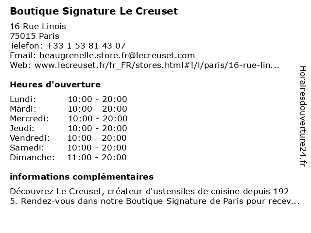 1 Boutique Signature Le Creuset (Distance: 4,10 km) 14 Rue Tronchet, 75008 Paris accessoires de cuisine, boutique, cadeaux pâtisserie, casserole, cocotte en fonte émaillée, cocotte à pain, coffrets cadeaux, creuset, kitchen supply store, le, le creuser, magasin de cuisine, magasin de matériel de cuisine, magasin ustensile cuisine, materiel cuisine, moules à gâteaux, signature, ustensiles de cuisine 2 Boutique DIM - Corner (Distance: 0,03 km) 7 Rue Linois, 75015 Paris boutique, chaussette, collants, corner, culottes, dim, lingerie 3 Boutique Anja (Distance: 0,03 km) 7 rue Linois, 75015 Paris accessoires, anja, boutique, habillement, mode, vêtements 4 Boutique SFR PARIS BEAUGRENELLE (Distance: 0,06 km) 5 RUE LINOIS, 75015 Paris beaugrenelle, boutique, boutique mobile, internet, paris, service, sfr 5 Renault Retail Group (Boutique) (Distance: 0,51 km) 29 De Grenelle, 75015 Paris automobiles, boutique, garage, group, motos - concessionnaire, renault, retail 6 Boutique Oksana Mukha (Distance: 0,93 km) 58 avenue Théophile Gautier, 75016 Paris boutique, cocktail, creation, mariage, mariée, mukha, oksana, robes  |