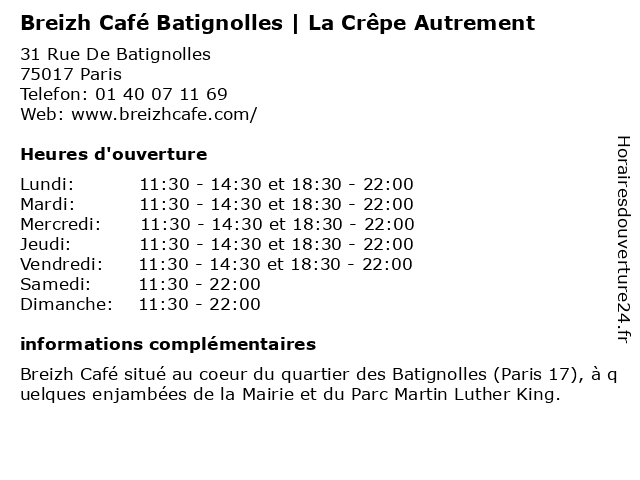 | Mardi | 11:30-14:30 et 18:30-22:00 |