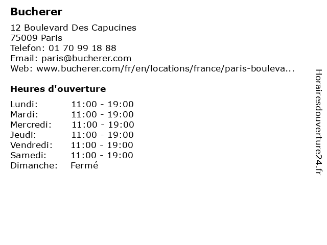 1 Bucherer (Distance: 0,01 km) 12 Boulevard des Capucines, 75009 Paris bucherer, diamanten, edelsteine, juwelen, juwelier, perlen, schmuck, trauringe, uhren, uhrenfachgeschäft, verlobungsringe 2 Bucherer - Official Rolex Retailer (Distance: 0,03 km) 12 Boulevard des Capucines, 75009 Paris bucherer, diamanten, edelsteine, juwelen, juwelier, official, perlen, retailer, rolex, schmuck, trauringe, uhren, uhrenfachgeschäft, verlobungsringe 3 Eurodif (Distance: 0,46 km) 58 Rue de la Chaussée d'Antin, 75009 Paris bijouterie, décoration, eurodif, mobilier 4 Bijouterie Emile (Distance: 4,75 km) 108-116 Avenue Charles de Gaulle, 92200 Neuilly-sur-Seine beaute, bijouterie, cafe, chaussures, emile, enfants, lingerie, mode femmes, mode hommes, restaurant, sport 5 Easy Cash (Distance: 19,08 km) 28 Rue Mercure, 91230 Montgeron bijouterie, cash, cultura, easy, loisirs, luxe, multimedia 6 Bijouterie Doria (Distance: 20,37 km) 1 Route Nationale, 95570 Moisselles bijou, bijouterie, bijoux, changement, doria |