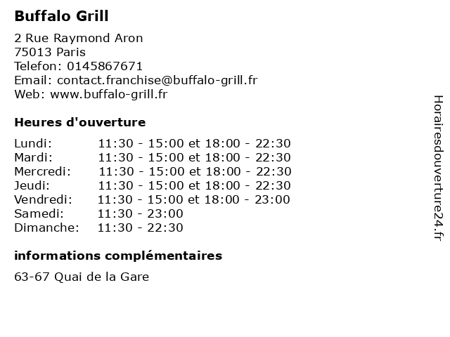 1 Buffalo Grill (Distance: 0,01 km) 63/67 Quai de la Gare, 75013 Paris barbecue, buffalo, business, food, grill, restaurants 2 Buffalo Grill (Distance: 4,70 km) . Rue de Paris Est, 77184 Emerainville buffalo, grill, restaurants, services 3 Buffalo Grill (Distance: 7,97 km) 6 Place du Maréchal Juin, 75017 Paris buffalo, grill, restaurants, services 4 Buffalo Grill (Distance: 9,26 km) 2 Avenue de la Paix, 94260 Fresnes buffalo, grill, restaurants, services 5 Buffalo Grill (Distance: 12,52 km) 4 Rue de la Pompadour, 94470 Boissy Saint Leger buffalo, grill, restaurants, services 6 Buffalo Grill (Distance: 13,31 km) . Allée des Guyonnes, 93240 Stains buffalo, grill, restaurants, services |