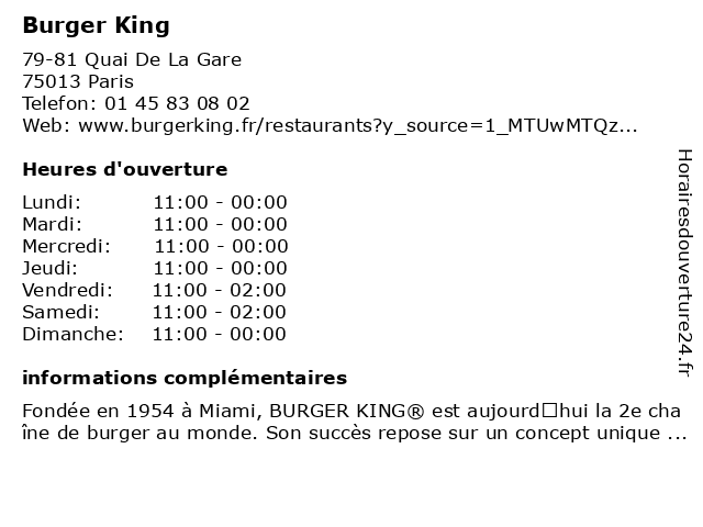 1 Burger King (Distance: 1,95 km) 20 Rue De La Roquette, 75011 Paris bar & gril, burger, king, restaurant américain, restaurant de hamburgers, restaurant familial, restaurant à emporter 2 Burger King (Distance: 2,36 km) 279 Avenue Daumesnil, 75012 Paris bar & gril, burger, king, restaurant américain, restaurant de hamburgers, restaurant familial, restaurant à emporter 3 Burger King (Distance: 2,83 km) 63 Avenue De Fontainebleau, 94270 Le Kremlin-Bicêtre bar & gril, burger, king, restaurant américain, restaurant de hamburgers, restaurant familial, restaurant à emporter 4 Burger King (Distance: 3,35 km) 2 Rue Pierre Lescot, 75001 Paris bar & gril, burger, king, restaurant américain, restaurant de hamburgers, restaurant familial, restaurant à emporter 5 Burger King (Distance: 3,58 km) 84 Boulevard Du Montparnasse, 75014 Paris bar & gril, burger, king, restaurant américain, restaurant de hamburgers, restaurant familial, restaurant à emporter 6 Burger King (Distance: 3,58 km) 23 Place De La Republique, 75003 Paris bar & gril, burger, king, restaurant américain, restaurant de hamburgers, restaurant familial, restaurant à emporter |