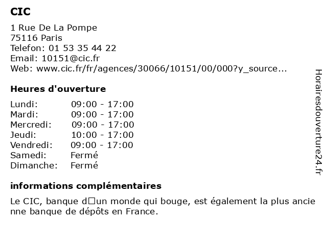1 CIC (Distance: 0,42 km) 51 Rue De La Pompe, 75116 Paris cic, compagnie de téléphone, organisme d'assurance 3 CIC (Distance: 2,07 km) 16 T Avenue Bosquet, 75007 Paris cic, compagnie de téléphone, organisme d'assurance 5 CIC (Distance: 3,66 km) 12 Rue D Astorg, 75008 Paris cic, compagnie de téléphone, organisme d'assurance 6 CIC (Distance: 3,67 km) 12 Rue D Astorg, 75008 Paris cic, compagnie de téléphone, organisme d'assurance |