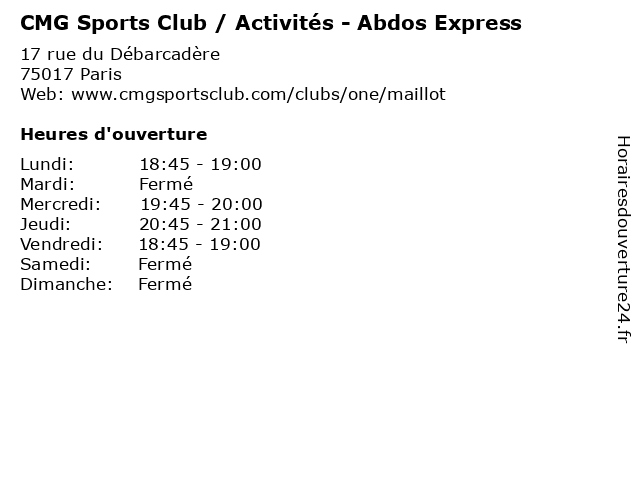 1 CMG Sport Club (Distance: 0,00 km) 17 Rue du Débarcadère, 75017 Paris business, club, cmg, fitness, gym, sport 2 CMG Sports Club / Activités - Power Sculpt (Distance: 0,00 km) 17 rue du Débarcadère, 75017 Paris activités, club, cmg, exercise, fitness, health, outdoor, physical activities, power, sculpt, sports 3 CMG Sports Club / Activités - Step (Distance: 0,00 km) 17 rue du Débarcadère, 75017 Paris activités, club, cmg, exercise, fitness, health, outdoor, physical activities, sports, step 4 CMG Sports Club / Activités - Cx Worx (Distance: 0,00 km) 17 rue du Débarcadère, 75017 Paris activités, club, cmg, cx, exercise, fitness, health, outdoor, physical activities, sports, worx 5 CMG Sports Club / Activités - TRX Evolution (Distance: 0,00 km) 17 rue du Débarcadère, 75017 Paris activités, club, cmg, evolution, exercise, fitness, health, outdoor, physical activities, sports, trx 6 CMG Sports Club / Activités - Boxe & Rope (Distance: 0,00 km) 17 rue du Débarcadère, 75017 Paris activités, boxe, club, cmg, exercise, fitness, health, outdoor, physical activities, rope, sports |
