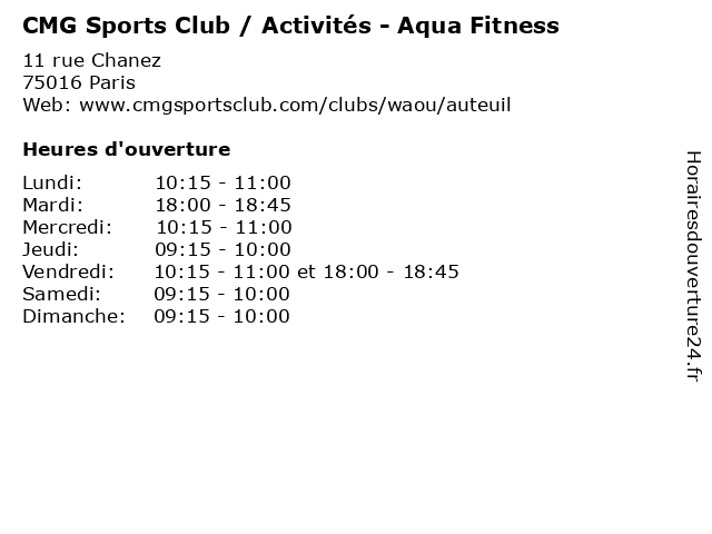 1 CMG Sports Club (Distance: 0,00 km) 11 rue Chanez, 75016 Paris club, cmg, exercise, fitness, health, outdoor, physical activities, sports 2 CMG Sports Club - Horaires D'Ouverture de la Piscine (Distance: 0,00 km) 11 rue Chanez, 75016 Paris club, cmg, d'ouverture, de, exercise, fitness, health, horaires, la, outdoor, physical activities, piscine, sports 3 CMG Sports Club / Activités - Aqua Cycling (Distance: 0,00 km) 11 rue Chanez, 75016 Paris activités, aqua, club, cmg, cycling, exercise, fitness, health, outdoor, physical activities, sports 4 CMG Sports Club / Activités - TRX Blast (Distance: 0,00 km) 11 rue Chanez, 75016 Paris activités, blast, club, cmg, exercise, fitness, health, outdoor, physical activities, sports, trx 5 CMG Sports Club / Activités - Aqua Training (Distance: 0,00 km) 11 rue Chanez, 75016 Paris activités, aqua, club, cmg, exercise, fitness, health, outdoor, physical activities, sports, training 6 CMG Sports Club / Activités - Basic Forme (Distance: 0,00 km) 11 rue Chanez, 75016 Paris activités, basic, club, cmg, exercise, fitness, forme, health, outdoor, physical activities, sports |