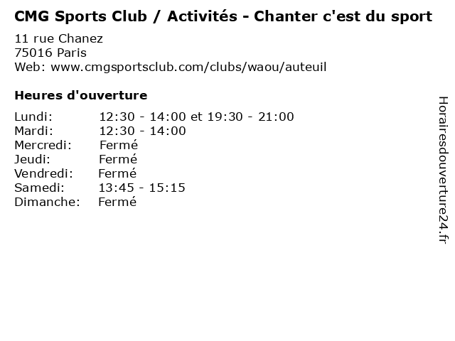1 CMG Sports Club (Distance: 0,00 km) 11 rue Chanez, 75016 Paris club, cmg, exercise, fitness, health, outdoor, physical activities, sports 2 CMG Sports Club - Horaires D'Ouverture de la Piscine (Distance: 0,00 km) 11 rue Chanez, 75016 Paris club, cmg, d'ouverture, de, exercise, fitness, health, horaires, la, outdoor, physical activities, piscine, sports 3 CMG Sports Club / Activités - Aqua Cycling (Distance: 0,00 km) 11 rue Chanez, 75016 Paris activités, aqua, club, cmg, cycling, exercise, fitness, health, outdoor, physical activities, sports 4 Laboratoire Zamaria - Paris 16e - BIOGROUP PARIS EST (Distance: 1,06 km) 49 Avenue De Versailles, 75016 Paris 16e, biogroup, dépistages, est, laboratoire, laboratoire de diagnostic, paris, zamaria 5 Chen Soleil d'Est (Distance: 1,86 km) 15 Rue du Théâtre, 75015 Paris asian, business, chen, d'est, foods, restaurants, soleil 6 Laboratoire Boulogne Point Du Jour - BIOGROUP PARIS EST (Distance: 2,05 km) 92 bis Rue Du Point Du Jour, 92100 Boulogne biogroup, boulogne, du, dépistages, est, jour, laboratoire, laboratoire de diagnostic, paris, point |