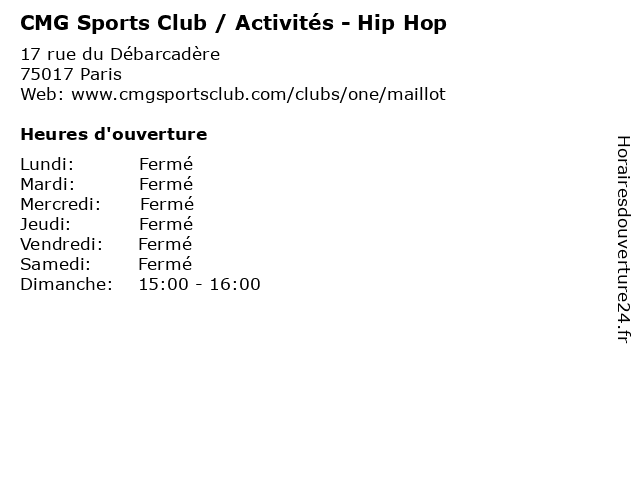 1 CMG Sports Club / Activités - Hip Hop (Distance: 3,93 km) 11 rue Chanez, 75016 Paris activités, club, cmg, exercise, fitness, health, hip, hop, outdoor, physical activities, sports 2 CMG Sport Club (Distance: 0,00 km) 17 Rue du Débarcadère, 75017 Paris business, club, cmg, fitness, gym, sport 3 CMG Sports Club One Monceau (Distance: 1,50 km) 24 Rue de Chazelles, 75017 Paris business, club, cmg, fitness, gym, monceau, one, sports 4 CMG Sports Club One Grenelle (Distance: 3,55 km) 8 Rue Frémicourt, 75015 Paris business, club, cmg, fitness, grenelle, gym, one, sports 5 CMG Sport Club (Distance: 4,31 km) 208 Rue de Vaugirard, 75015 Paris business, club, cmg, fitness, sport, sports 6 Centre d'animation Binet / Hip-Hop (Distance: 4,40 km) 28 avenue de la Porte de Montmartre, 75018 Paris binet, centre, centres d'animation, d'animation, equipement, hip, hop, jardins, l'heure, livre, médiathèque, services |