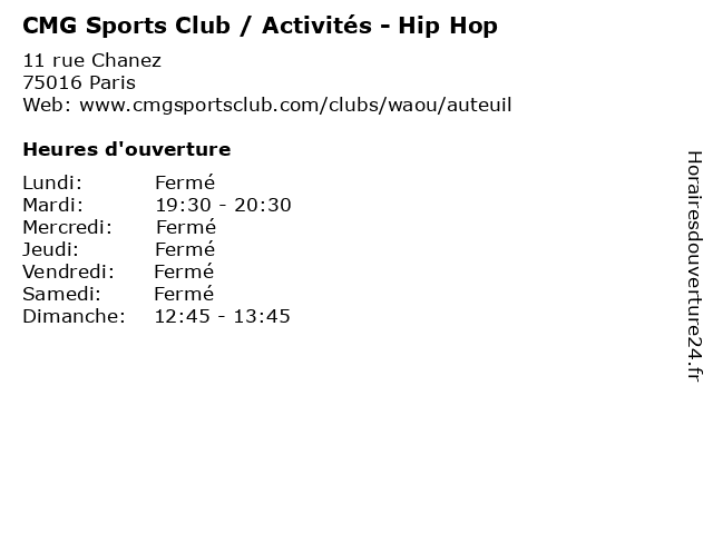 1 CMG Sports Club / Activités - Hip Hop (Distance: 3,93 km) 17 rue du Débarcadère, 75017 Paris activités, club, cmg, danse, exercise, fitness, health, hip, hop, orientale, outdoor, physical activities, sports 2 CMG Sports Club (Distance: 0,00 km) 11 rue Chanez, 75016 Paris club, cmg, exercise, fitness, health, outdoor, physical activities, sports 3 CMG Sports Club - Horaires D'Ouverture de la Piscine (Distance: 0,00 km) 11 rue Chanez, 75016 Paris club, cmg, d'ouverture, de, exercise, fitness, health, horaires, la, outdoor, physical activities, piscine, sports 4 CMG Sports Club / Activités - Aqua Cycling (Distance: 0,00 km) 11 rue Chanez, 75016 Paris activités, aqua, club, cmg, cycling, exercise, fitness, health, outdoor, physical activities, sports 5 CMG Sports Club / Activités - TRX Blast (Distance: 0,00 km) 11 rue Chanez, 75016 Paris activités, blast, club, cmg, exercise, fitness, health, outdoor, physical activities, sports, trx 6 CMG Sports Club / Activités - Aqua Training (Distance: 0,00 km) 11 rue Chanez, 75016 Paris activités, aqua, club, cmg, exercise, fitness, health, outdoor, physical activities, sports, training |