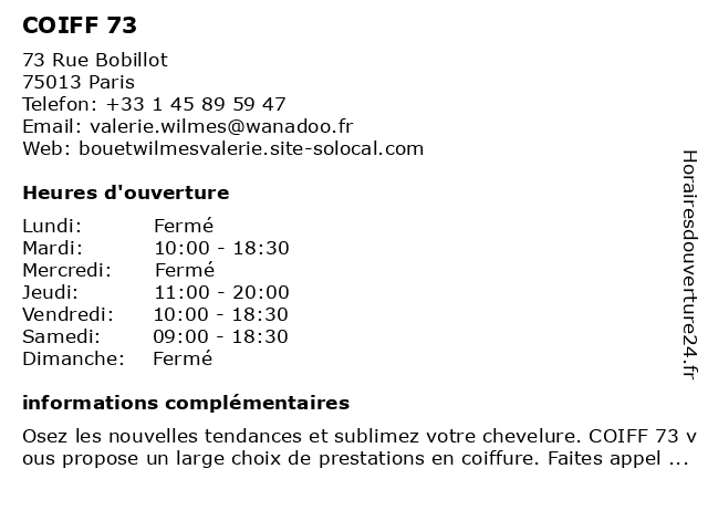 1 Art Coiff (Distance: 2,34 km) 7 Rue le Goff, 75005 Paris art, balayage, coiff, coiffeur, coiffure, coloration, coupe, mèche 2 Regus - Paris, 73 Vaugirard (Distance: 2,94 km) 73 Rue De Vaugirard, 75006 Paris 73, espace de coworking, paris, regus, vaugirard 3 High Coiff (Distance: 4,16 km) 29 Boulevard de Stalingrad, 92240 Malakoff balayage, brushing, coiff, coiffeur, coiffure, coloration, coupe, high 4 DS Coiff Barber Chic (Distance: 5,23 km) 114 Rue Paul Vaillant Couturier, 94140 Alfortville barber, barbier, chic, coiff, coiffeur, ds, et, homme 6 |