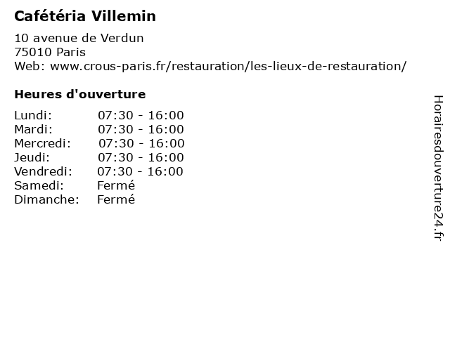 1 Jardin Villemin (Du 29 octobre au 28 février) (Distance: 0,17 km) 14 rue des Récollets, 75010 Paris 28, 29, au, du, février, jardin, octobre, parc, square, villemin 2 Jardin Villemin (Du 01 au 24 mars) (Distance: 0,17 km) 14 rue des Récollets, 75010 Paris 01, 24, au, du, jardin, mars, parc, square, villemin 3 Jardin Villemin (Du 25 mars au 29 avril et septembre) (Distance: 0,17 km) 14 rue des Récollets, 75010 Paris 25, 29, au, avril, du, et, jardin, mars, parc, septembre, square, villemin 4 Jardin Villemin (Du 30 avril au 31 août) (Distance: 0,17 km) 14 rue des Récollets, 75010 Paris 30, 31, août, au, avril, du, jardin, parc, square, villemin 5 Cafétéria IUT Pajol (Distance: 1,13 km) - rue du Département, 75018 Paris cafétéria, campus, iut, pajol, restaurant, universitaire 6 Cafétéria Clignancourt (Distance: 2,84 km) 2 rue Francis de Croisset, 75018 Paris cafétéria, campus, clignancourt, restaurant, universitaire |