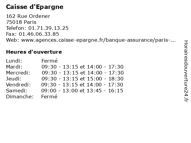 1 Caisse d'Epargne (Distance: 0,73 km) 74 Rue Ordener, 75018 Paris assurances, banques, caisse, d'epargne, services 2 Caisse d'Epargne (Distance: 0,91 km) 48 Rue des Abbesses, 75018 Paris assurances, banques, caisse, d'epargne, services 3 Caisse d'Epargne (Distance: 1,23 km) 33 Boulevard Barbes, 75018 Paris assurances, banques, caisse, d'epargne, services 4 Caisse d'Epargne (Distance: 1,62 km) 62 Rue de Rochechouart, 75009 Paris assurances, banques, caisse, d'epargne, services 5 Caisse d'Epargne (Distance: 1,65 km) 64 Rue D'amsterdam, 75009 Paris assurances, banques, caisse, d'epargne, services 6 Caisse d'Epargne (Distance: 2,36 km) 16 Rue Halevy, 75009 Paris assurances, banques, caisse, d'epargne, services  |