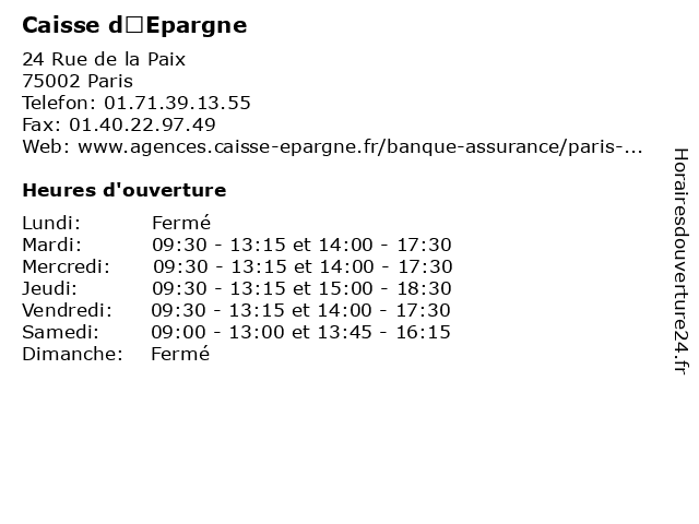 1 Caisse d’Epargne (Distance: 0,76 km) 100 Rue Saint-Lazare, 75009 Paris assurances, banques, caisse, d'epargne, d’epargne, services 2 Caisse d’Epargne (Distance: 1,92 km) 15 Rue du Four, 75006 Paris assurances, banques, caisse, d'epargne, d’epargne, services 3 Caisse d’Epargne (Distance: 2,08 km) 57 Rue de Paris, 97400 Saint-Denis agences, assurance, banque, caisse, d’epargne, emprunter, investir, économiser 4 Caisse d’Epargne (Distance: 4,42 km) 77 Avenue des Gobelins, 75013 Paris assurances, banques, caisse, d'epargne, d’epargne, services 5 Caisse d’Epargne (Distance: 10,96 km) 12 Avenue de Joinvill, 94130 Nogent-sur-Marne assurances, banques, caisse, d'epargne, d’epargne, services 6 Caisse d’Epargne (Distance: 16,29 km) - Centre Commercial Les Arcades, 93193 Noisy Le Grand assurances, banques, caisse, d'epargne, d’epargne, services |