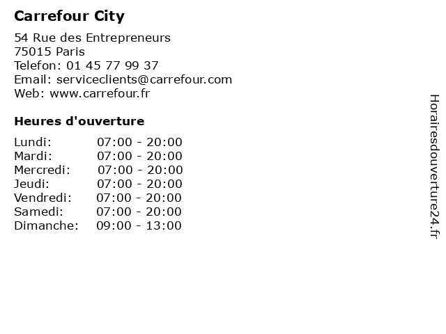 1 Carrefour City (Distance: 0,01 km) 54 Rue des Entrepreneurs, 75015 Paris alimentation, carrefour, city, epiceries, supérette 2 Carrefour City (Distance: 0,24 km) 62/64 rue Emile Zola, 75015 Paris carrefour, city, hard discount, hypermarchés, les dépanneurs, supermarchés 3 Carrefour City (Distance: 0,72 km) 148 Rue du Théâtre, 75015 Paris alimentaire, alimentation, carrefour, city, courses, distributeur, hypermarché, supermarché, épicerie 4 Carrefour City (Distance: 1,11 km) 25 rue Desnouettes, 75015 Paris carrefour, city, hard discount, hypermarchés, les dépanneurs, supermarchés 5 Carrefour City (Distance: 2,31 km) 6 Rue Saint-Didier, 75016 Paris alimentation, carrefour, city, epiceries, supérette 6 Carrefour City (Distance: 3,33 km) 142 Avenue de Malakoff, 75016 Paris alimentaire, alimentation, carrefour, city, courses, distributeur, hypermarché, supermarché, épicerie |