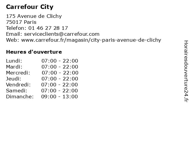 1 Carrefour City (Distance: 0,41 km) 50-54 Rue Pouchet, 75017 Paris alimentation, carrefour, city, magasin discount, market, supermarché 2 Carrefour City (Distance: 0,64 km) 85 Rue Jouffroy d'Abbans, 75017 Paris alimentation, carrefour, city, magasin discount, market, supermarché 3 Carrefour City (Distance: 0,78 km) 39 Avenue de Saint Ouen, 75017 Paris alimentation, carrefour, city, magasin discount, market, supermarché 4 Carrefour City (Distance: 1,17 km) 136 Rue Lamarck, 75018 Paris alimentation, carrefour, city, magasin discount, market, supermarché 5 Carrefour City (Distance: 1,33 km) 133 Rue Damremont, 75018 Paris alimentaire, alimentation, carrefour, city, courses, distributeur, hypermarché, supermarché, épicerie 6 Carrefour City (Distance: 1,63 km) 133 Rue Damrémont, 75018 Paris alimentation, carrefour, city, epiceries, supérette |