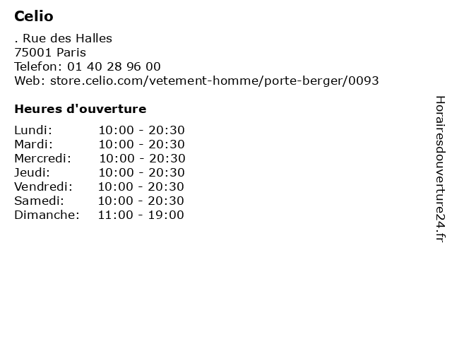 3 Celio (Distance: 2,40 km) 13 Rue d'Amsterdam, 75008 Paris cafe, celio, chaussures, enfants, homme, mode femme, restaurant, service, sport 4 Celio (Distance: 2,46 km) 1 Cour de Rome, 75008 Paris alimentation, beauté & sante, celio, culture & loisirs, enfants, high-tech, maison & déco, mode, restaurants 5 Celio (Distance: 2,50 km) 22 Rue du Départ, 75015 Paris beaute, cafe, celio, chaussures, enfants, mode femmes, mode hommes, restaurant, sport 6 Celio (Distance: 2,69 km) 112 rue de Maubeuge, 75010 Paris celio, pret a porter hommes, services, station |