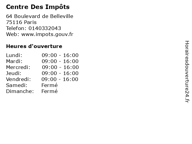 1 Centre Des Impôts (Distance: 1,65 km) 18 All Darius Milhaud, 75116 Paris administration, centre, des, impôts, services publics 2 Centre Des Impôts (Distance: 2,33 km) 42 Rue de Paradis, 75116 Paris administration, centre, des, impôts, services publics 3 Centre Des Impôts (Distance: 2,42 km) 5-7 Avenue De Bouvines, 75116 Paris administration, centre, des, impôts, services publics 4 Centre Des Impôts (Distance: 2,61 km) 69 Rue Riquet, 75116 Paris administration, centre, des, impôts, services publics 5 Centre Des Impôts (Distance: 3,29 km) 14 Rue de Richelieu, 75116 Paris administration, centre, des, impôts, services publics 6 Centre Des Impôts (Distance: 4,04 km) 23b Rue de I'Universite, 75116 Paris administration, centre, des, impôts, services publics |