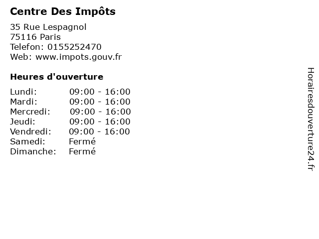 1 Centre Des Impôts (Distance: 0,95 km) 5-7 Avenue De Bouvines, 75116 Paris administration, centre, des, impôts, services publics 2 Centre Des Impôts (Distance: 2,88 km) 18 All Darius Milhaud, 75116 Paris administration, centre, des, impôts, services publics 3 Centre Des Impôts (Distance: 3,59 km) 42 Rue de Paradis, 75116 Paris administration, centre, des, impôts, services publics 4 Centre Des Impôts (Distance: 4,10 km) 69 Rue Riquet, 75116 Paris administration, centre, des, impôts, services publics 5 Centre Des Impôts (Distance: 4,52 km) 83 Avenue d'Italie, 75116 Paris administration, centre, des, impôts, services publics 6 Centre Des Impôts (Distance: 4,63 km) 23b Rue de I'Universite, 75116 Paris administration, centre, des, impôts, services publics |