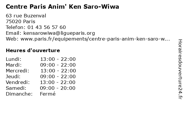 1 Centre d'animation Ken Saro-Wiwa (Distance: 0,02 km) 63 rue Buzenval, 75020 Paris centre, centre d'animation, d'animation, equipement, joyeuse, ken, l'heure, livre, médiathèque, saro, services, wiwa 3 Centre Paris Anim' Pôle Simon Lefranc (Distance: 3,55 km) 9 rue Simon Lefranc, 75004 Paris anim', centre, espace exposition, lefranc, paris, pôle, salle arts plastiques, salle informatique, salles de musique, simon 6 Center Paris Anim'Montparnasse (Distance: 6,23 km) 26 allé du Chef d'escadron de Guillebon, 75014 Paris anim'montparnasse, animation, center, centre, montparnasse, paris, paris'anim |
